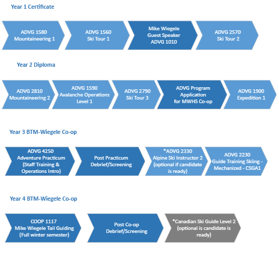 Diploma students will first complete a series of lower-level courses to lay the foundation for the Heli Ski Guide Coop position. These courses include: