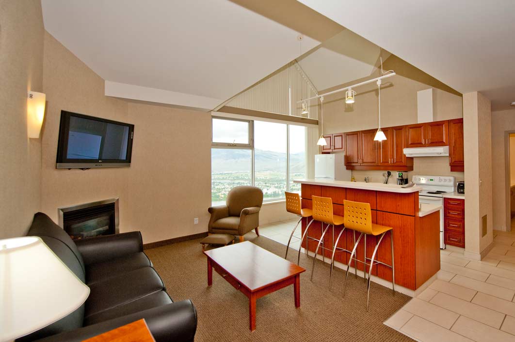 Enjoy the comforts of the spacious Executive Loft Suite with vaulted ceilings on the 11th floor. The suite features a gas fireplace, flat-screen televisions, quality leather furnishings and floor-to-ceiling windows with breathtaking views of the city. This suite has a private bedroom with a queen-sized bed. You will have access to local telephone service, satellite television, and complementary Internet access.