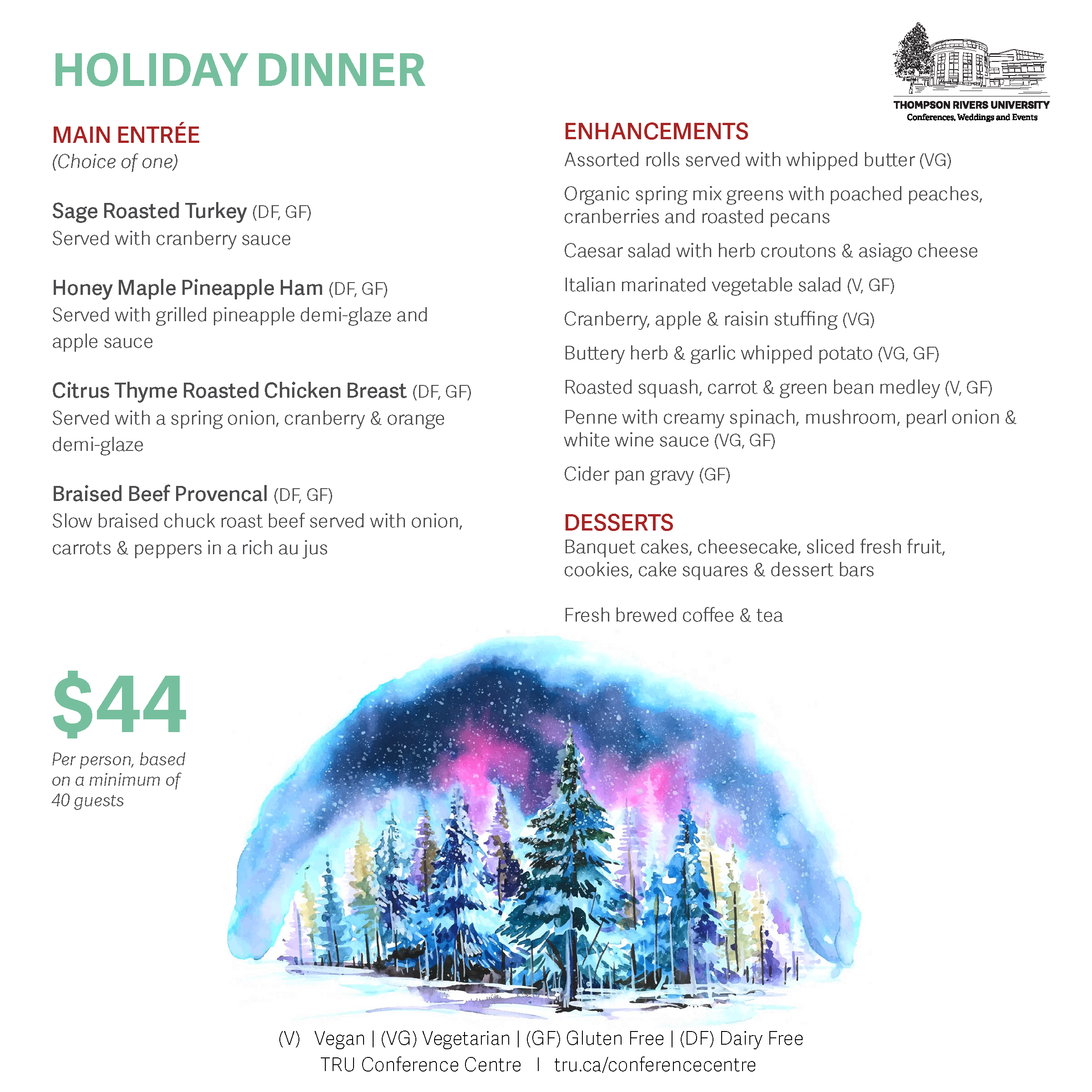 Celebrate the holidays with your staff, friends or family at the TRU Conference Centre. We offer a number of venue spaces with varying capacity, all of which will be festively decorated. The most popular Holiday rooms are the Grand Hall, Mountain Room, Terrace Room or The Den