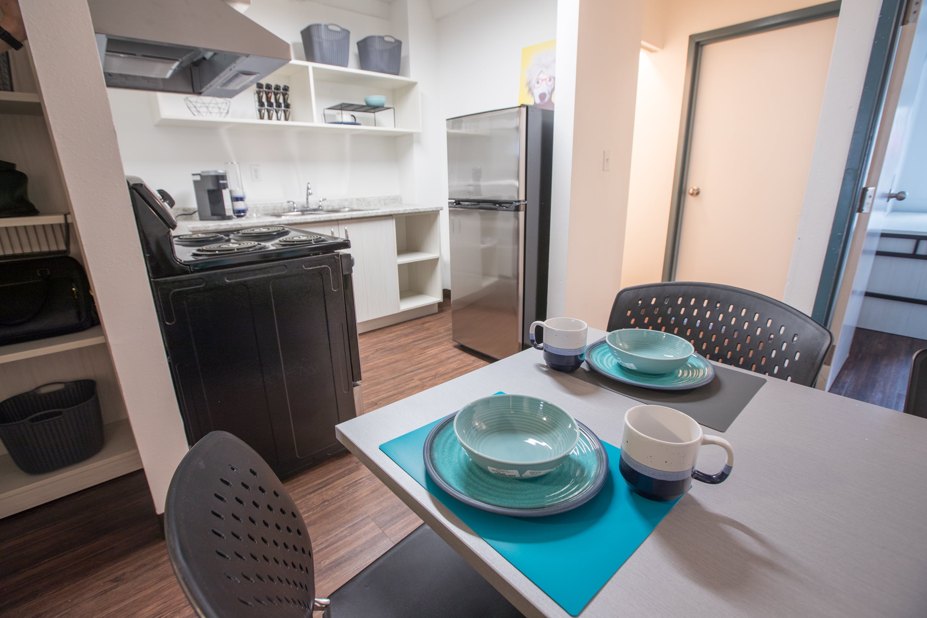 - A bed, desk, sink, kitchen with microwave, stove and fridge in each room