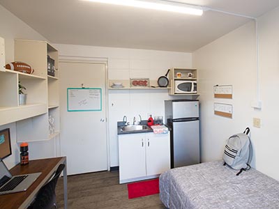 • A bed, desk, wireless internet, sink, kitchen with microwave, and fridge in each room