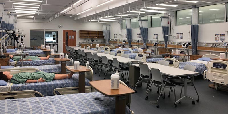 Outfitted with 16 beds and basic technology to resemble a hospital ward. Here, students practice basic assessments and case scenarios. This space is a key component to applying, practicing, and studying skills as they are being learned in class.